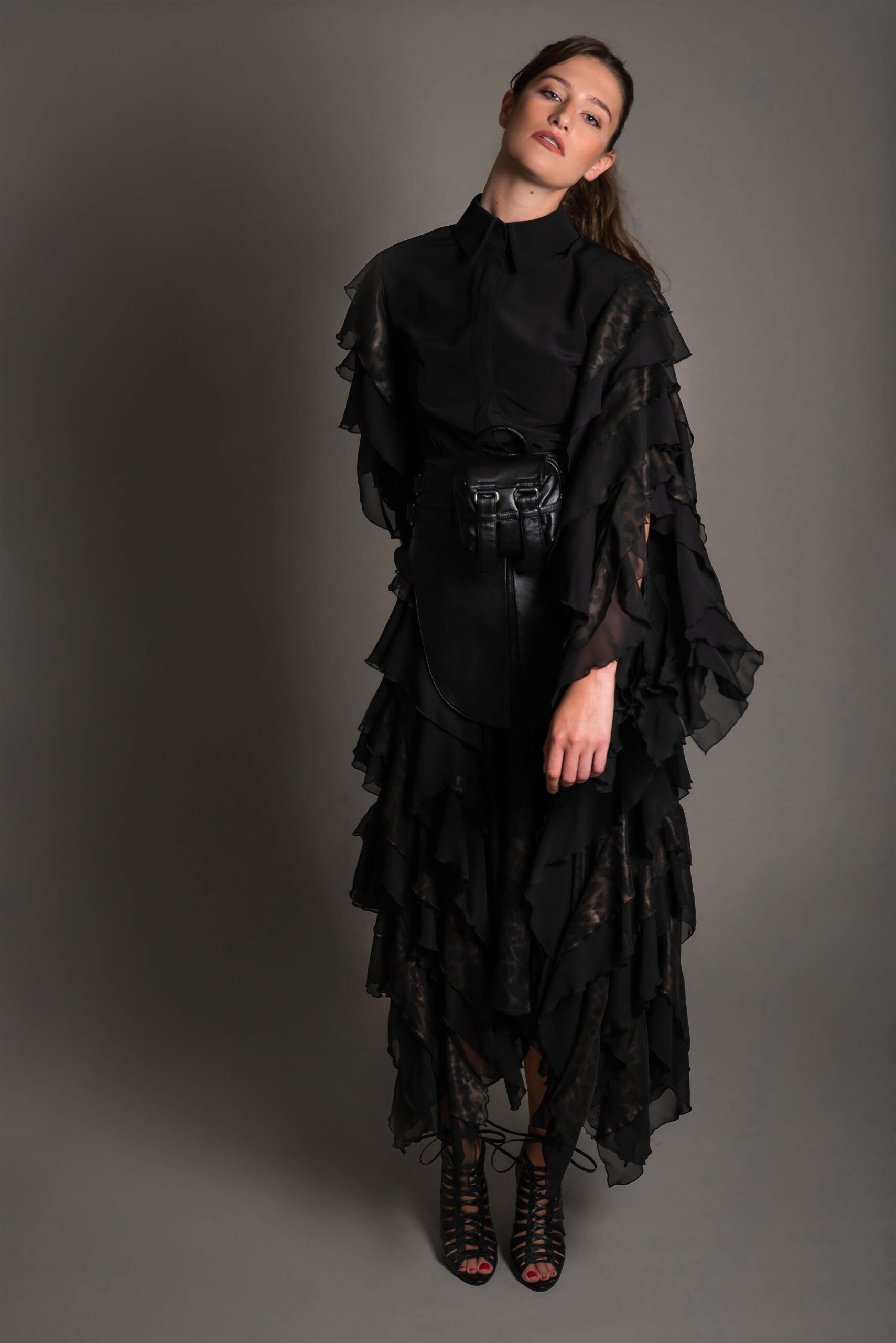 Chiffon Crepe Two-Piece Set with Leather Belt & Mini Bag